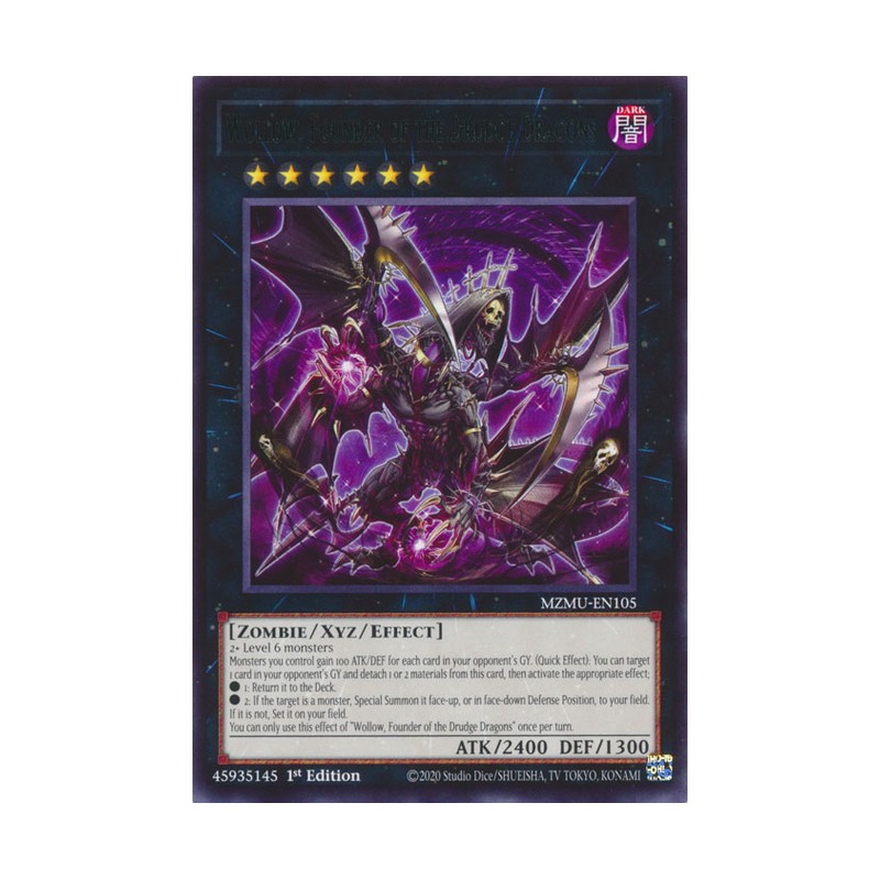 Texto (EN): 2+ Level 6 monsters Monsters you control gain 100 ATK/DEF for each card in your opponent's GY. (Quick Effect): You can target 1 card in your opponent's GY and detach 1 or 2 materials from this card, then activate the appropriate effect; ● 1: Return it to the Deck. ● 2: If the target is a monster, Special Summon it face-up, or in face-down Defense Position, to your field. If it is not, Set it on your field. You can only use this effect of "Wollow, Founder of the Drudge Dragons" once per turn.