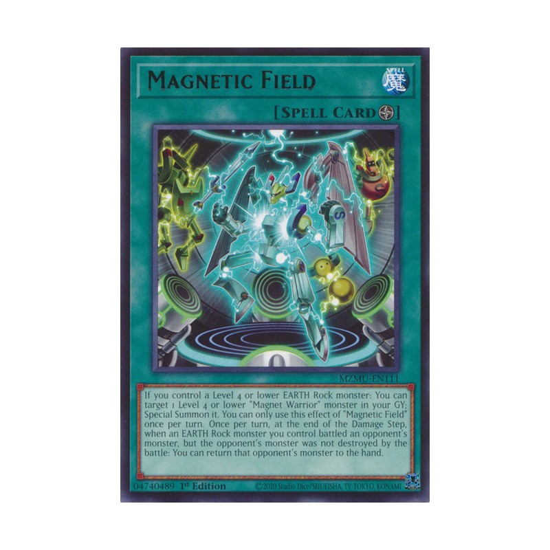 Texto (EN): If you control a Level 4 or lower EARTH Rock monster: You can target 1 Level 4 or lower "Magnet Warrior" monster in your GY; Special Summon it. You can only use this effect of "Magnetic Field" once per turn. Once per turn, at the end of the Damage Step, when an EARTH Rock monster you control battled an opponent's monster, but the opponent's monster was not destroyed by the battle: You can return that opponent's monster to the hand.