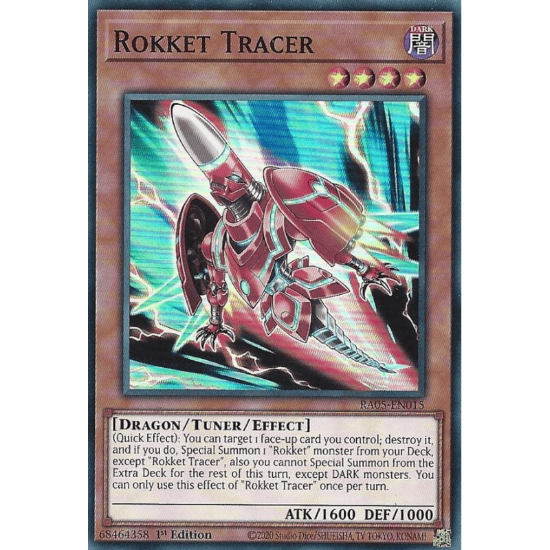 Texto (EN): (Quick Effect): You can target 1 face-up card you control; destroy it, and if you do, Special Summon 1 "Rokket" monster from your Deck, except "Rokket Tracer", also you cannot Special Summon from the Extra Deck for the rest of this turn, except DARK monsters. You can only use this effect of "Rokket Tracer" once per turn.