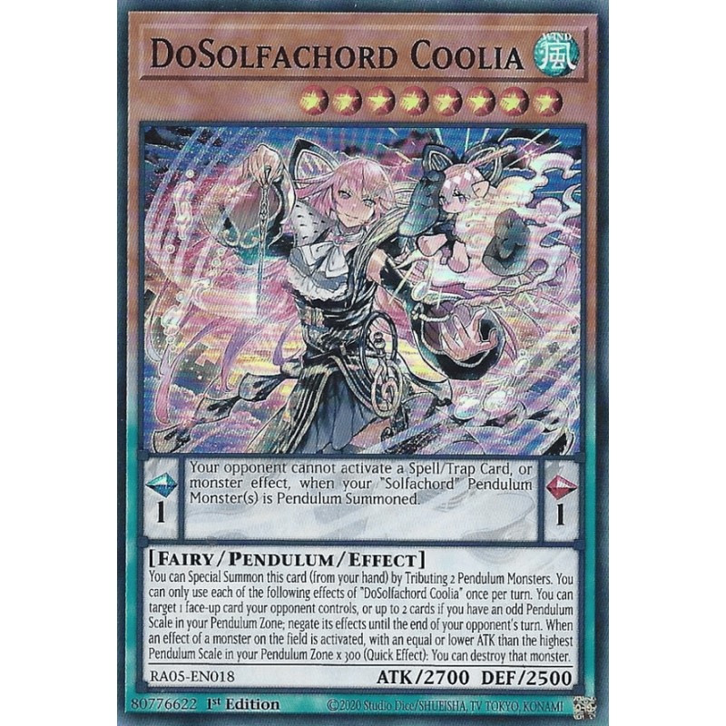 Texto (EN): Pendulum Effect Your opponent cannot activate a Spell/Trap Card, or monster effect, when your "Solfachord" Pendulum Monster(s) is Pendulum Summoned. Monster Effect You can Special Summon this card (from your hand) by Tributing 2 Pendulum Monsters. You can only use each of the following effects of "DoSolfachord Coolia" once per turn. You can target 1 face-up card your opponent controls, or up to 2 cards if you have an odd Pendulum Scale in your Pendulum Zone; negate its effects until the end of your opponent's turn. When an effect of a monster on the field is activated, with an equal or lower ATK than the highest Pendulum Scale in your Pendulum Zone x 300: You can destroy that monster.