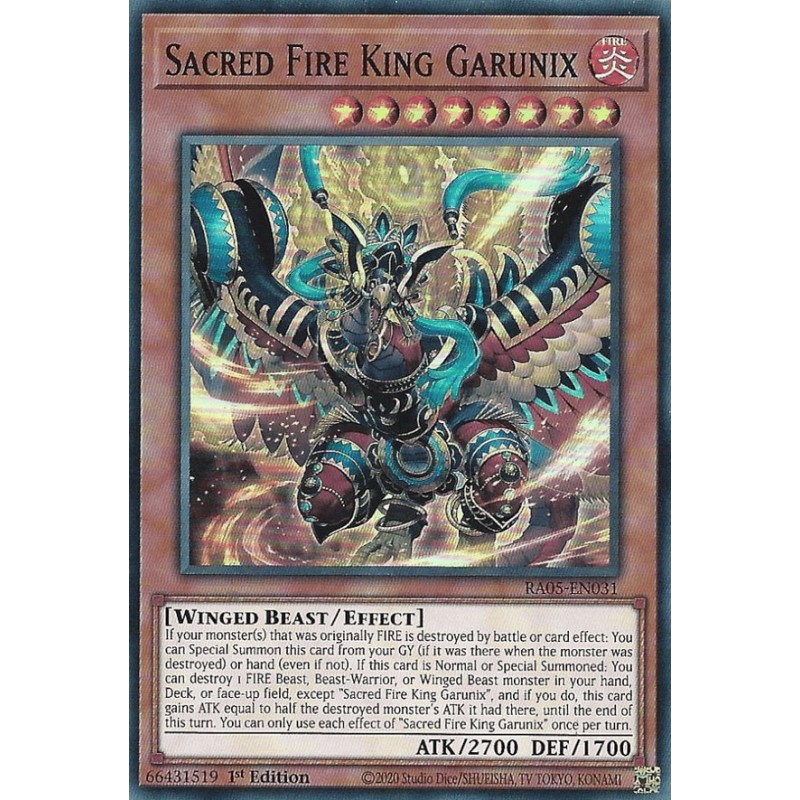 Texto (EN): If your monster(s) that was originally FIRE is destroyed by battle or card effect: You can Special Summon this card from your GY (if it was there when the monster was destroyed) or hand (even if not). If this card is Normal or Special Summoned: You can destroy 1 FIRE Beast, Beast-Warrior, or Winged Beast monster in your hand, Deck, or face-up field, except "Sacred Fire King Garunix", and if you do, this card gains ATK equal to half the destroyed monster's ATK it had there, until the end of this turn. You can only use each effect of "Sacred Fire King Garunix" once per turn.