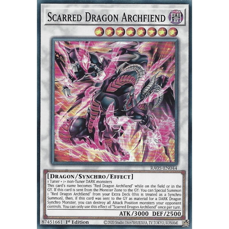 Texto (EN): 1 Tuner + 1+ non-Tuner DARK monsters This card's name becomes "Red Dragon Archfiend" while on the field or in the GY. If this card is sent from the Monster Zone to the GY: You can Special Summon 1 "Red Dragon Archfiend" from your Extra Deck (this is treated as a Synchro Summon), then, if this card was sent to the GY as Synchro Material for a DARK Dragon Synchro Monster, you can destroy all Attack Position monsters your opponent controls. You can only use this effect of "Scarred Dragon Archfiend" once per turn.