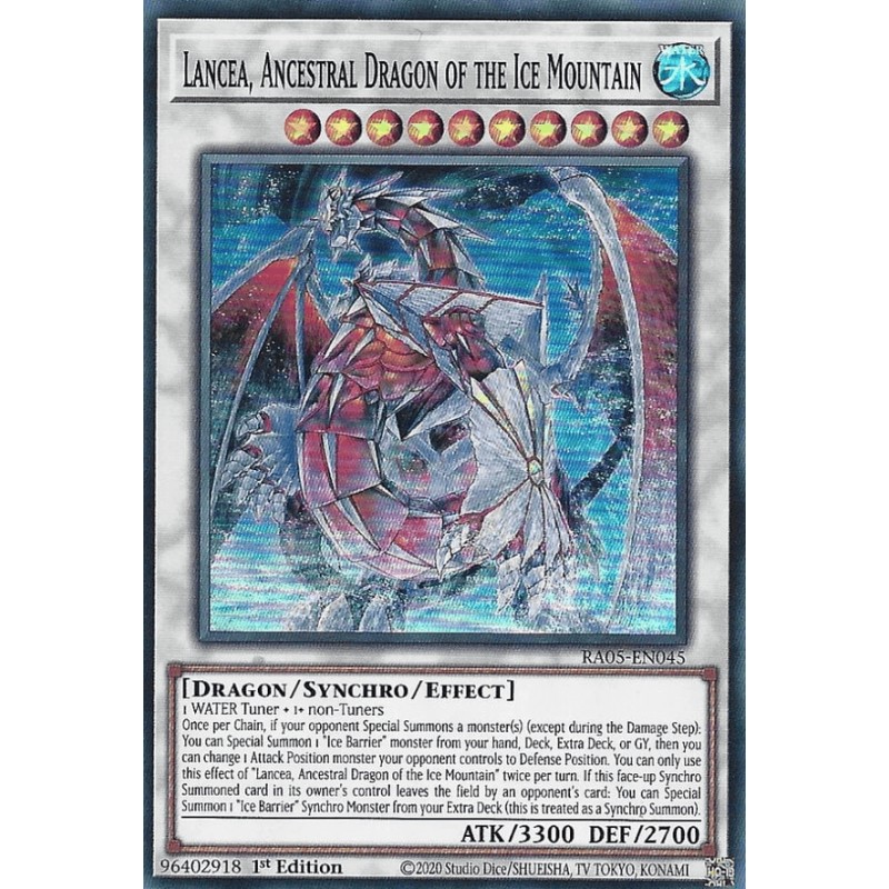 Texto (EN): 1 WATER Tuner + 1+ non-Tuner monsters Once per Chain, if your opponent Special Summons a monster(s) (except during the Damage Step): You can Special Summon 1 "Ice Barrier" monster from your hand, Deck, Extra Deck, or GY, then you can change 1 Attack Position monster your opponent controls to Defense Position. You can only use this effect of "Lancea, Ancestral Dragon of the Ice Mountain" twice per turn. If this face-up Synchro Summoned card in its owner's control leaves the field because of an opponent's card: You can Special Summon 1 "Ice Barrier" Synchro Monster from your Extra Deck. (This is treated as a Synchro Summon.)