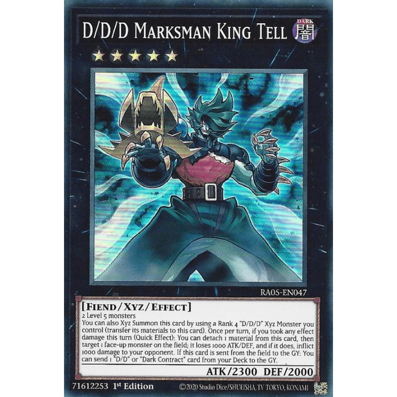 Texto (EN): 2 Level 5 monsters You can also Xyz Summon this card by using a Rank 4 "D/D/D" Xyz Monster you control as the Xyz Material. (Xyz Materials attached to that monster also become Xyz Materials on this card.) Once per turn, during either player's turn, if you took any effect damage this turn: You can detach 1 Xyz Material from this card, then target 1 face-up monster on the field; it loses 1000 ATK and DEF, and if it does, inflict 1000 damage to your opponent. If this card is sent from the field to the Graveyard: You can send 1 "D/D" or "Dark Contract" card from your Deck to the Graveyard.