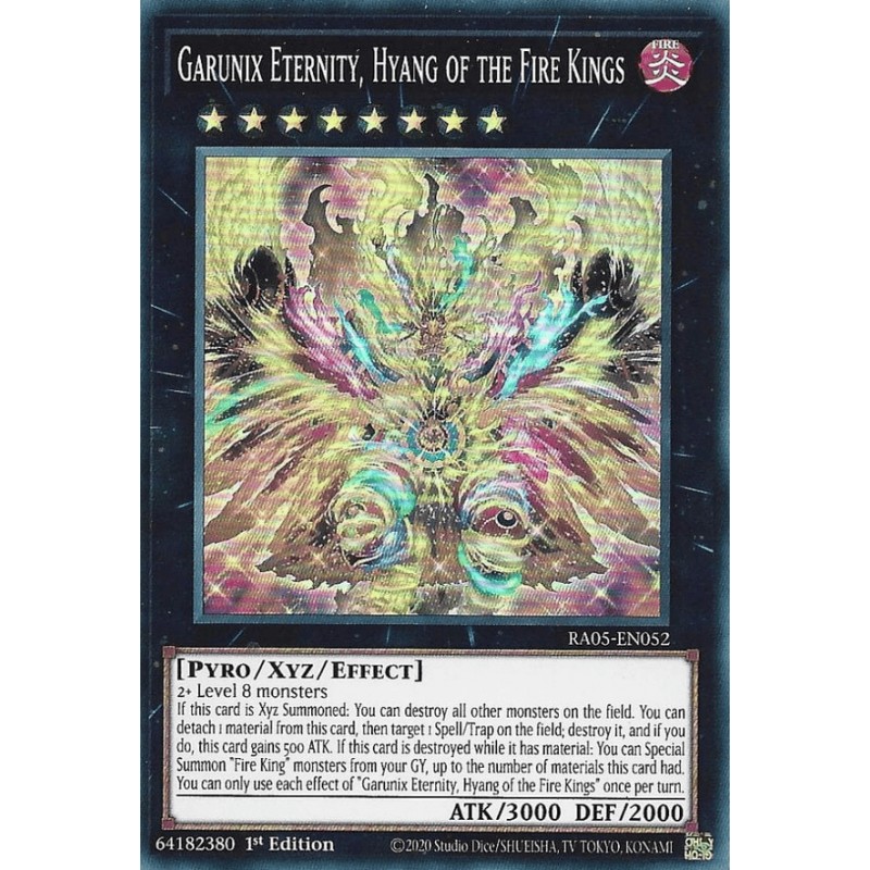 Texto (EN): 2+ Level 8 monsters If this card is Xyz Summoned: You can destroy all other monsters on the field. You can detach 1 material from this card, then target 1 Spell/Trap on the field; destroy it, and if you do, this card gains 500 ATK. If this card is destroyed while it has material: You can Special Summon "Fire King" monsters from your GY, up to the number of materials this card had. You can only use each effect of "Garunix Eternity, Hyang of the Fire Kings" once per turn.