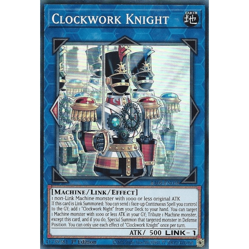 Texto (EN): 1 non-Link Machine monster with 1000 or less original ATK If this card is Link Summoned: You can send 1 face-up Continuous Spell you control to the GY; add 1 "Clockwork Night" from your Deck to your hand. You can target 1 Machine monster with 1000 or less ATK in your GY; Tribute 1 Machine monster, except this card, and if you do, Special Summon that targeted monster in Defense Position. You can only use each effect of "Clockwork Knight" once per turn.