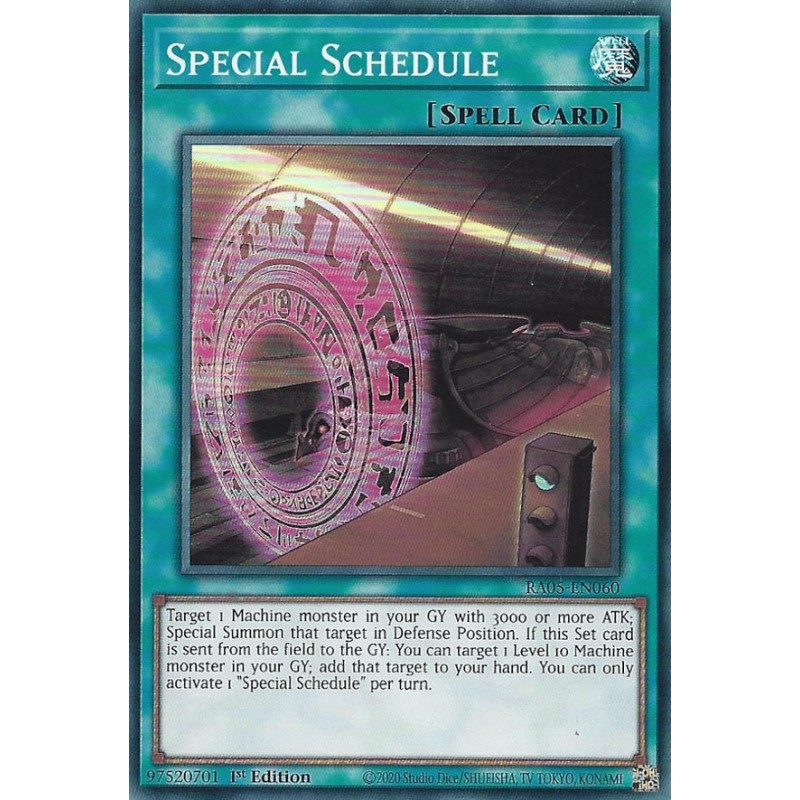 Texto (EN): Target 1 Machine monster in your GY with 3000 or more ATK; Special Summon that target in Defense Position. If this Set card is sent from the field to the GY: You can target 1 Level 10 Machine monster in your GY; add that target to your hand. You can only activate 1 "Special Schedule" per turn.