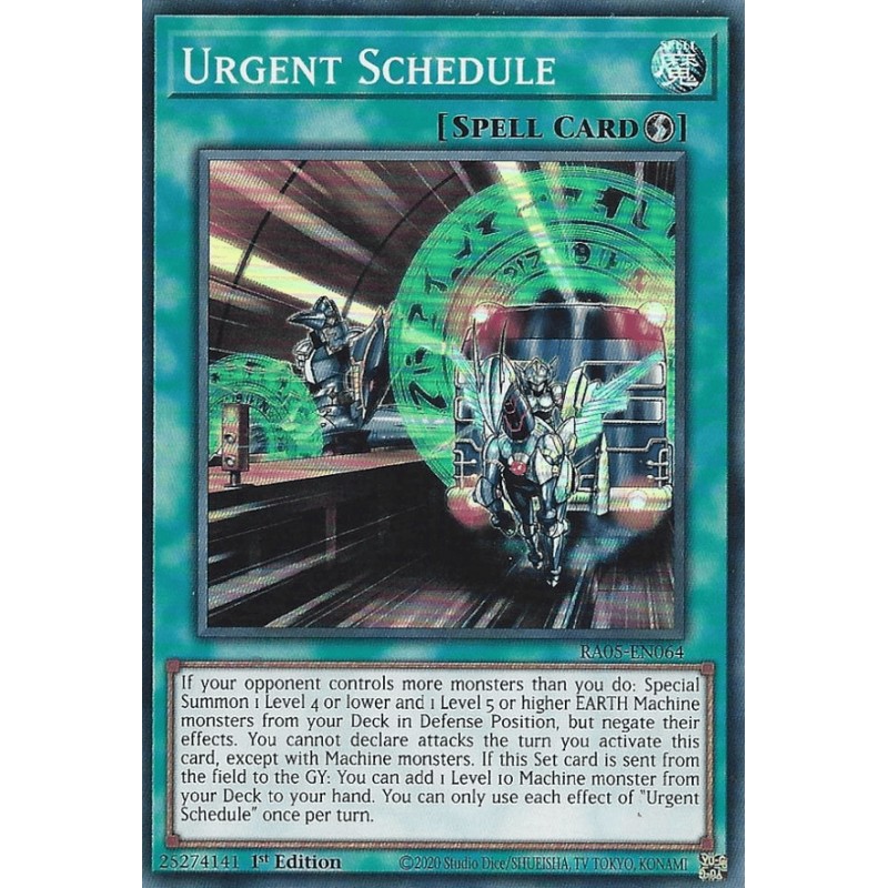 Texto (EN): If your opponent controls more monsters than you do: Special Summon 1 Level 4 or lower and 1 Level 5 or higher EARTH Machine monsters from your Deck in Defense Position, but negate their effects. You cannot declare attacks the turn you activate this card, except with Machine monsters. If this Set card is sent from the field to the GY: You can add 1 Level 10 Machine monster from your Deck to your hand. You can only use each effect of "Urgent Schedule" once per turn.
