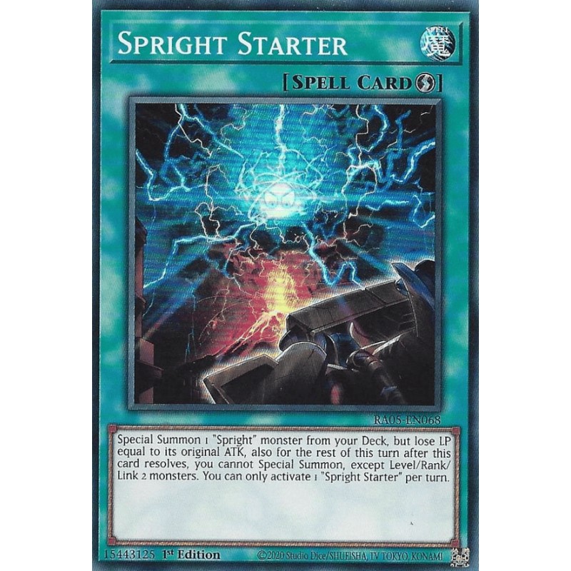 Texto (EN): Special Summon 1 "Spright" monster from your Deck, but lose LP equal to its original ATK, also for the rest of this turn after this card resolves, you cannot Special Summon, except Level/Rank/Link 2 monsters. You can only activate 1 "Spright Starter" per turn.