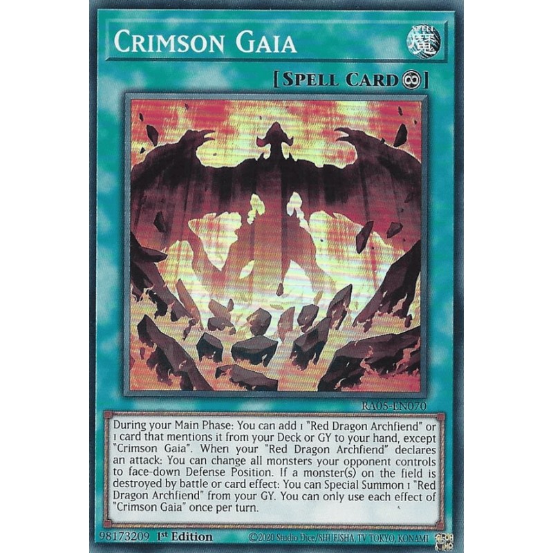 Texto (EN): During your Main Phase: You can add 1 "Red Dragon Archfiend" or 1 card that mentions it from your Deck or GY to your hand, except "Crimson Gaia". When your "Red Dragon Archfiend" declares an attack: You can change all monsters your opponent controls to face-down Defense Position. If a monster(s) on the field is destroyed by battle or card effect: You can Special Summon 1 "Red Dragon Archfiend" from your GY. You can only use each effect of "Crimson Gaia" once per turn.