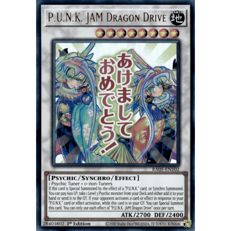 Texto (EN): 1 Psychic Tuner + 1+ non-Tuner monsters If this card is Special Summoned by the effect of a "P.U.N.K." card, or Synchro Summoned: You can pay 600 LP; take 1 Level 3 Psychic monster from your Deck and either add it to your hand or send it to the GY. If your opponent activates a card or effect in response to your "P.U.N.K." card or effect activation, while this card is in your GY: You can Special Summon this card. You can only use each effect of "P.U.N.K. JAM Dragon Drive" once per turn.