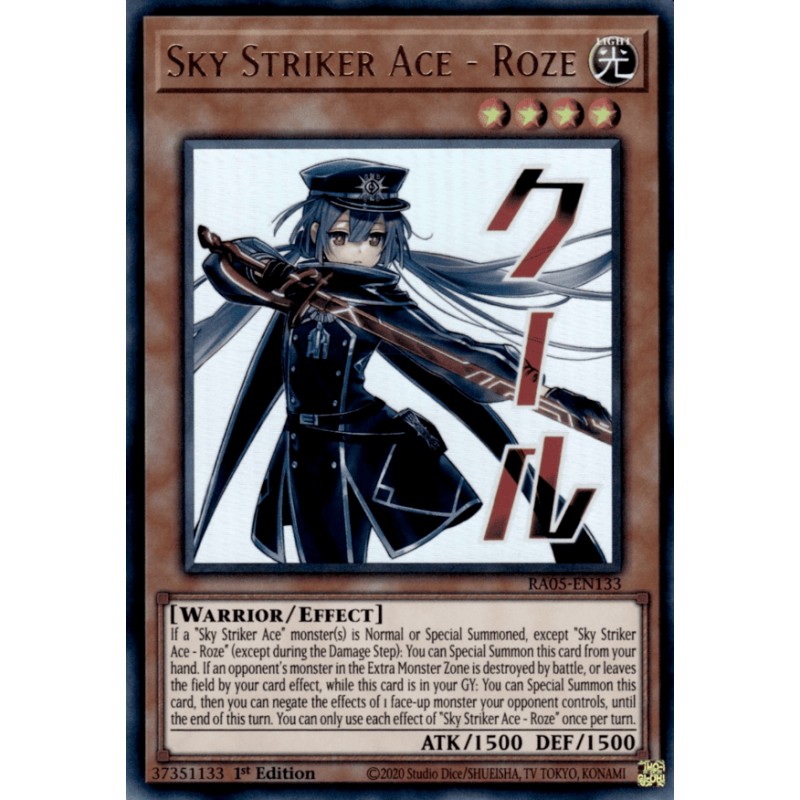 Texto (EN): If a "Sky Striker Ace" monster(s) is Normal or Special Summoned, except "Sky Striker Ace - Roze" (except during the Damage Step): You can Special Summon this card from your hand. If an opponent's monster in the Extra Monster Zone is destroyed by battle, or leaves the field because of your card effect, while this card is in your GY: You can Special Summon this card, then you can negate the effects of 1 face-up monster your opponent controls, until the end of this turn. You can only use each effect of "Sky Striker Ace - Roze" once per turn.