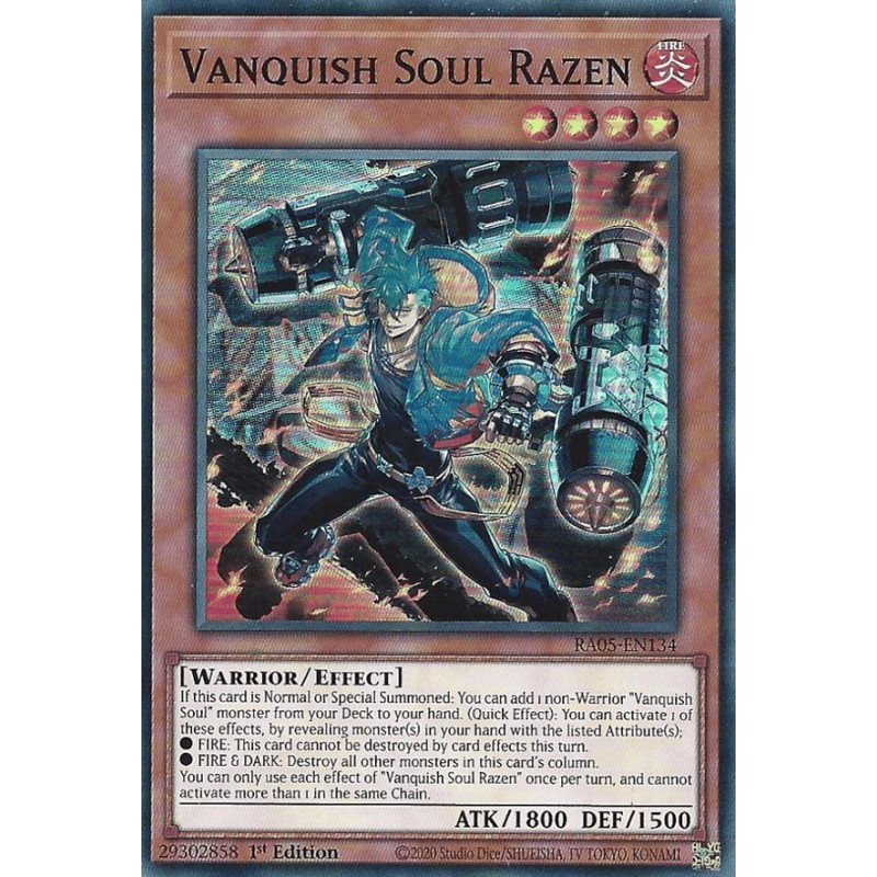 Texto (EN): If this card is Normal or Special Summoned: You can add 1 non-Warrior "Vanquish Soul" monster from your Deck to your hand. (Quick Effect): You can activate 1 of these effects, by revealing monster(s) in your hand with the listed Attribute(s); ● FIRE: This card cannot be destroyed by card effects this turn. ● FIRE & DARK: Destroy all other monsters in this card's column. You can only use each effect of "Vanquish Soul Razen" once per turn, and cannot activate more than 1 in the same Chain.