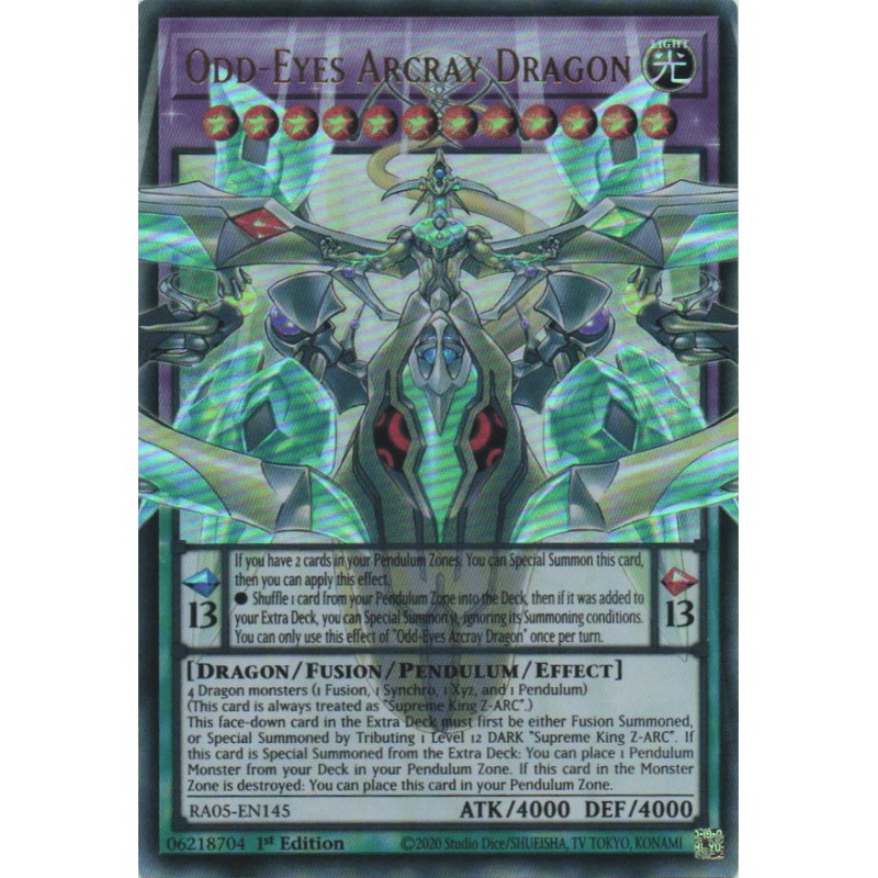 Texto (EN): Pendulum Effect If you have 2 cards in your Pendulum Zones: You can Special Summon this card, then you can apply this effect. ● Shuffle 1 card from your Pendulum Zone into the Deck, then if it was added to your Extra Deck, you can Special Summon it, ignoring its Summoning conditions. You can only use this effect of "Odd-Eyes Arcray Dragon" once per turn. Monster Effect 4 Dragon monsters (1 Fusion, 1 Synchro, 1 Xyz, and 1 Pendulum) (This card is always treated as "Supreme King Z-ARC".) This face-down card in the Extra Deck must first be either Fusion Summoned, or Special Summoned by Tributing 1 Level 12 DARK "Supreme King Z-ARC". If this card is Special Summoned from the Extra Deck: You can place 1 Pendulum Monster from your Deck in your Pendulum Zone. If this card in the Monster Zone is destroyed: You can place this card in your Pendulum Zone.