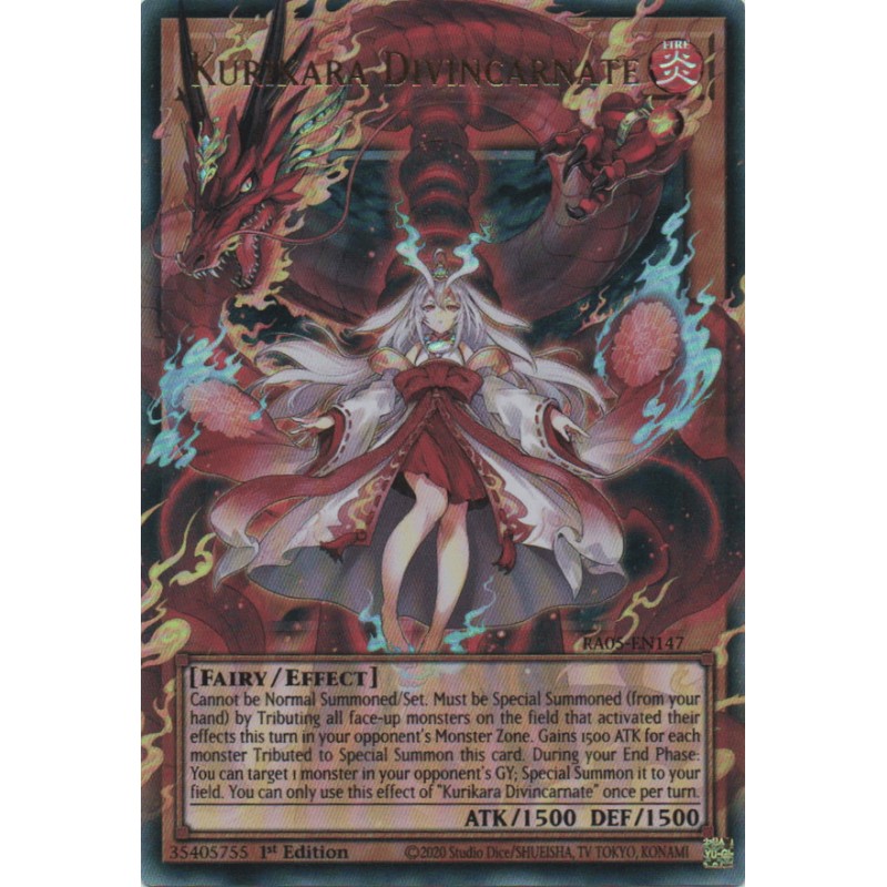 Texto (EN): Cannot be Normal Summoned/Set. Must be Special Summoned (from your hand) by Tributing all face-up monsters on the field that activated their effects this turn in your opponent's Monster Zone. Gains 1500 ATK for each monster Tributed to Special Summon this card. During your End Phase: You can target 1 monster in your opponent's GY; Special Summon it to your field. You can only use this effect of "Kurikara Divincarnate" once per turn.