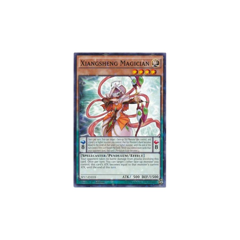 Texto (EN): Pendulum Effect: Once per turn: You can target 1 face-up Xyz Monster you control, and 1 Level 5 or higher monster you control; that Xyz Monster's Rank becomes equal to the Level of that Level 5 or higher monster, until the end of this turn (even if this card leaves the field). While you control more cards than your opponent does, this card's Pendulum Scale becomes 4. Monster Effect: Your opponent takes no battle damage from attacks involving this card. Once per turn: You can target 1 other face-up monster you control; this card's ATK becomes equal to that monster's current ATK, until the end of this turn.