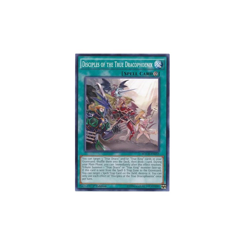 Texto (EN): You can target 3 "True Draco" and/or "True King" cards in your Graveyard; shuffle them into the Deck, then draw 1 card. During your Main Phase, you can: Immediately after this effect resolves, Tribute Summon 1 "True Draco" or "True King" monster face-up. If this card is sent from the Spell & Trap Zone to the Graveyard: You can target 1 Spell/Trap Card on the field; destroy it. You can only use each effect of "Disciples of the True Dracophoenix" once per turn.